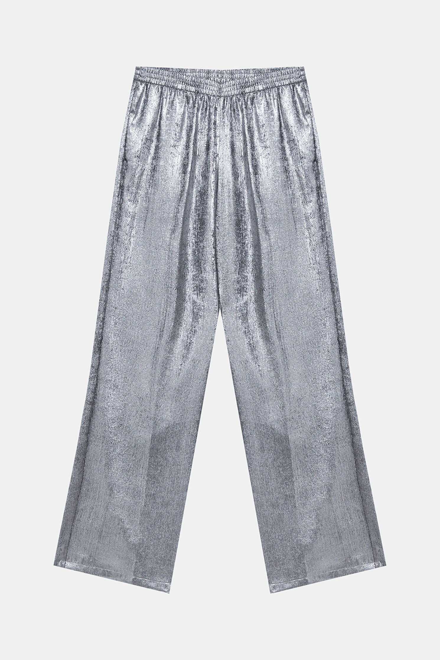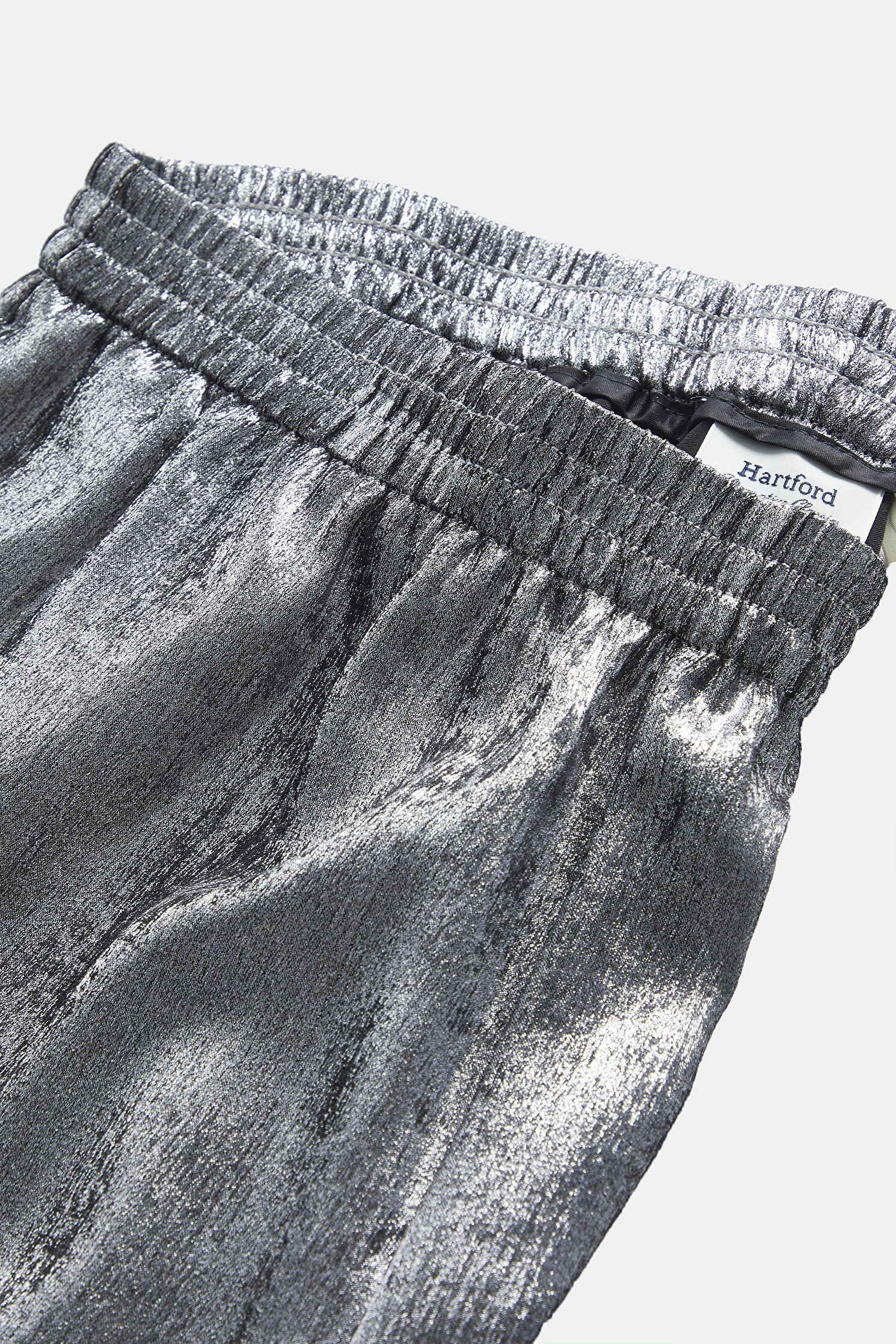 Elastik bel bandına sahip olan gümüş renkli Hartford yüksek bel pantolon, bol paça formu ve yan cepleri ile dikkat çekiyor.