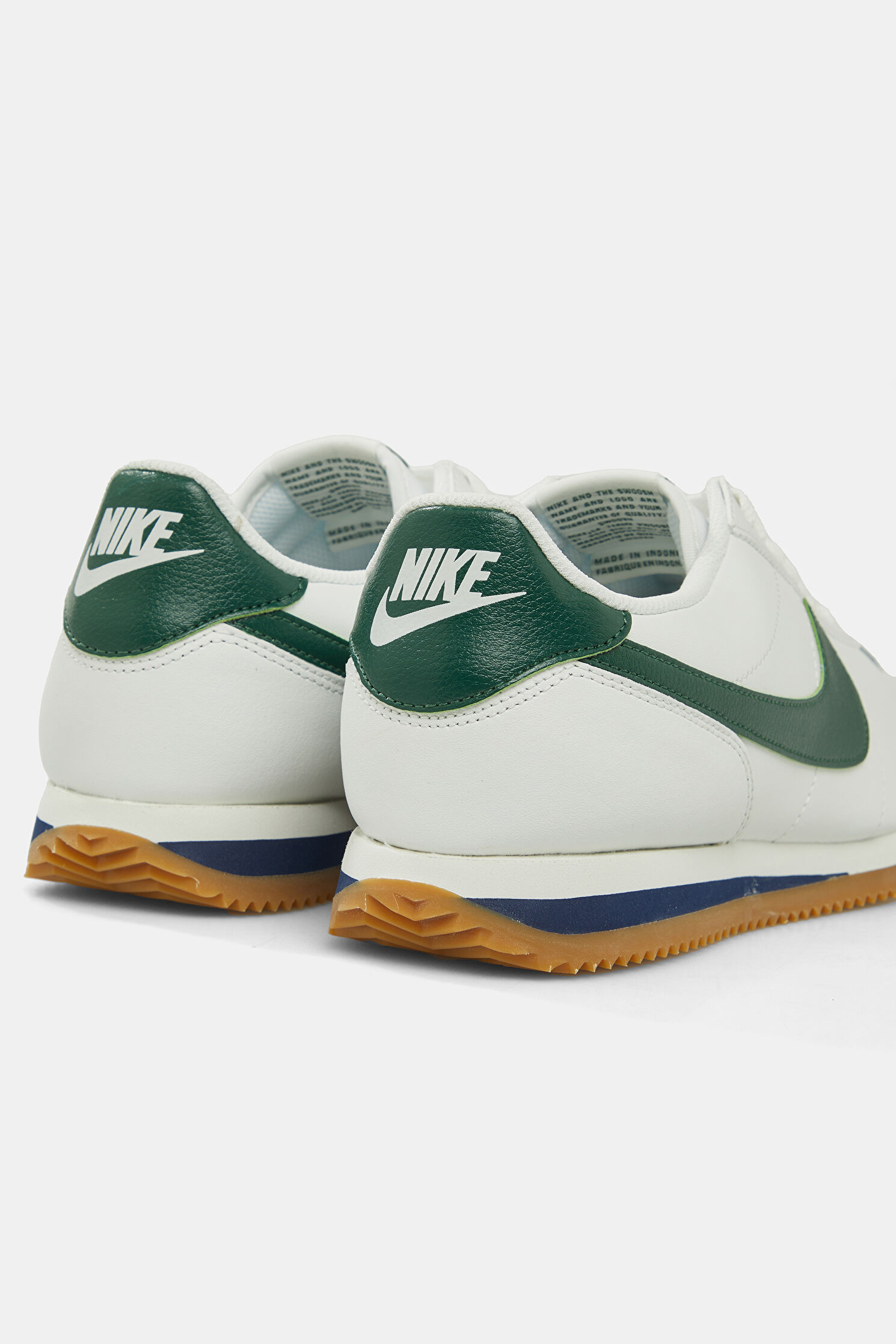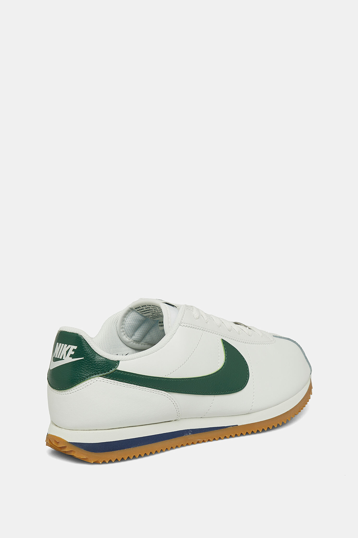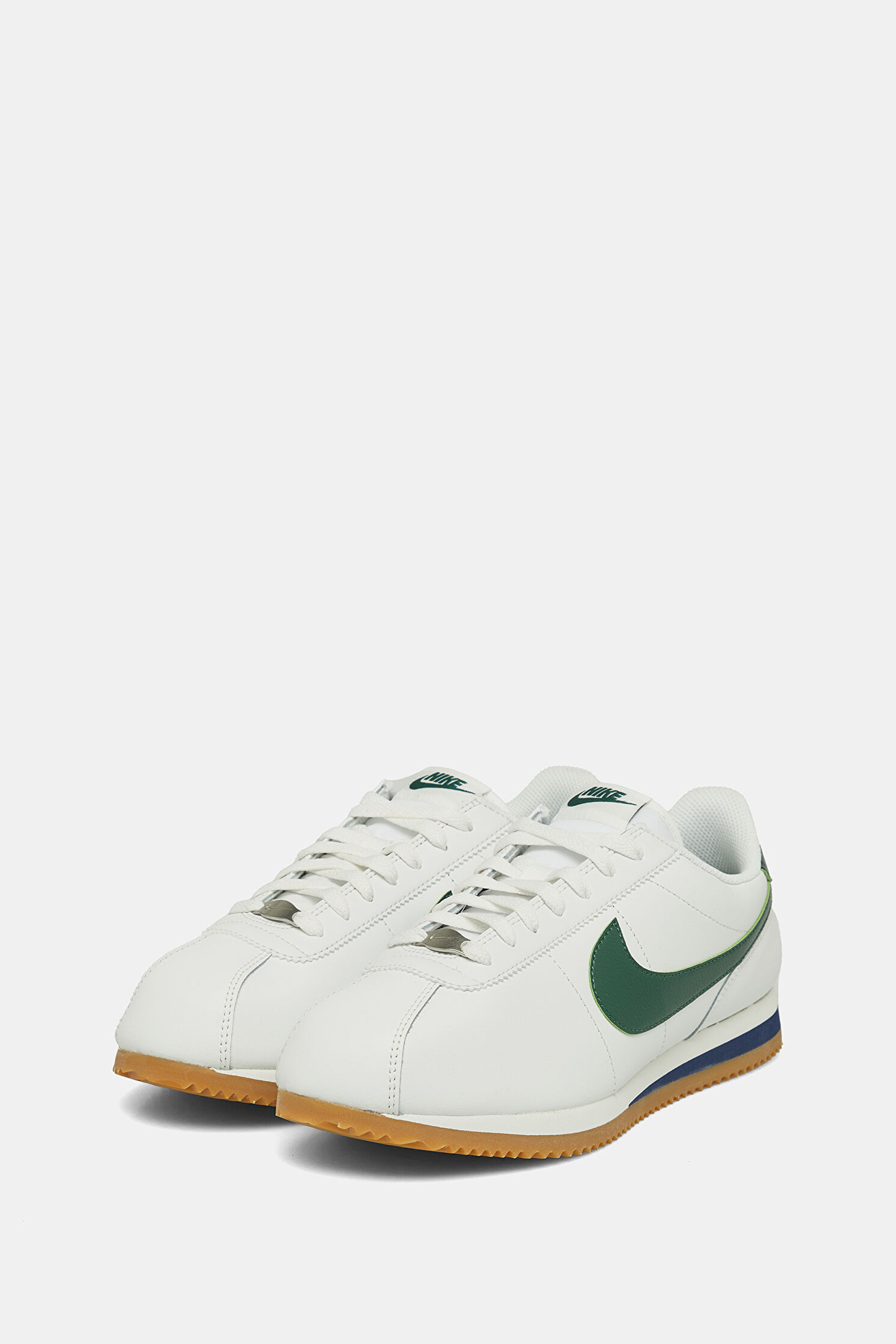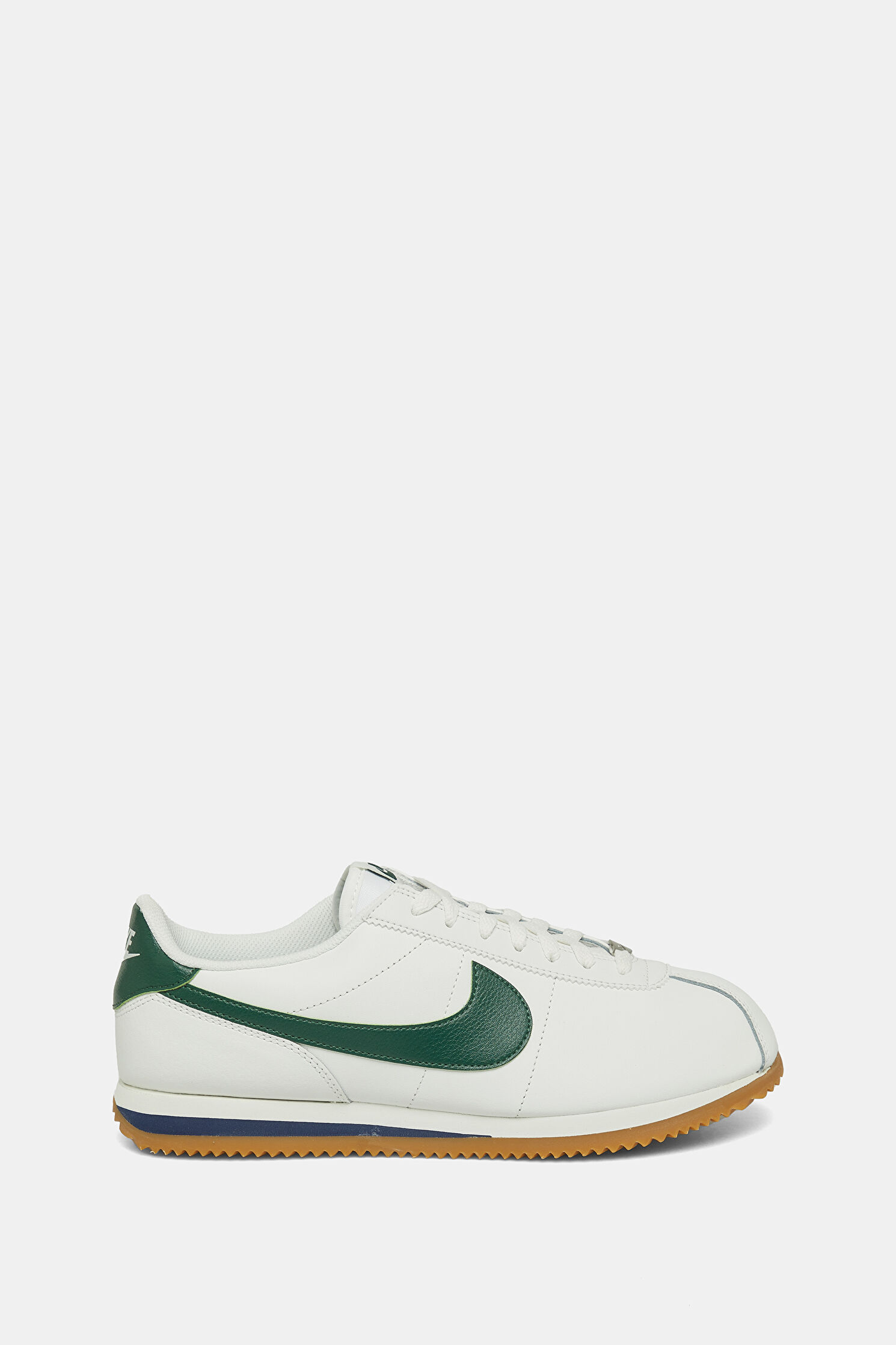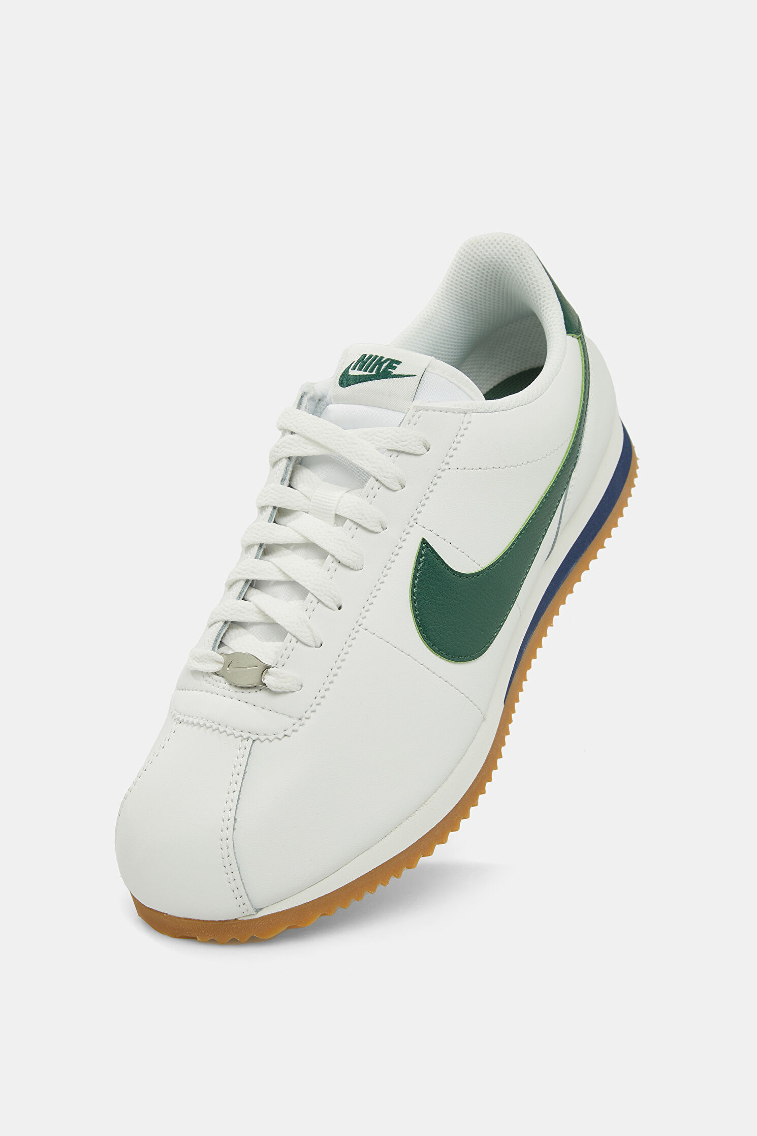 Dil kısmında ve yanda yeşil renk logo detayına dikkat çeken beyaz renkli Nike Cortez spor ayakkabı, bağcıklıdır. Bu tasarım, sığır derisi karışımlı materyalden üretilmiştir.