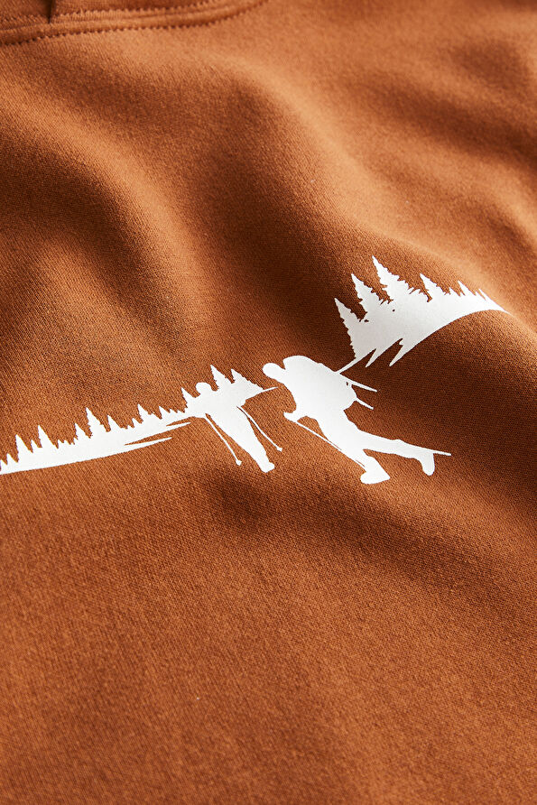 Solid uzun kollu sweatshirt, pamuk karışımlı kumaşı ve kontrast renkli baskıları ile dikkat çekiyor. Kiremit renkli bu model, kapüşon ve kanguru cep detayına sahiptir.