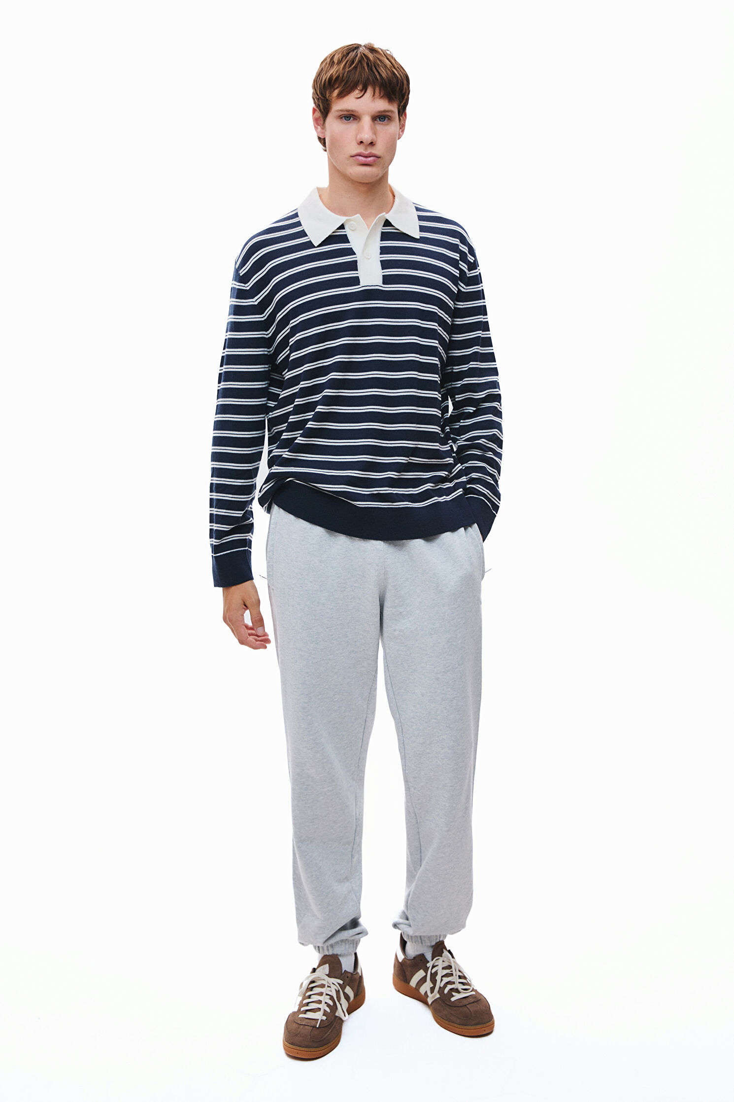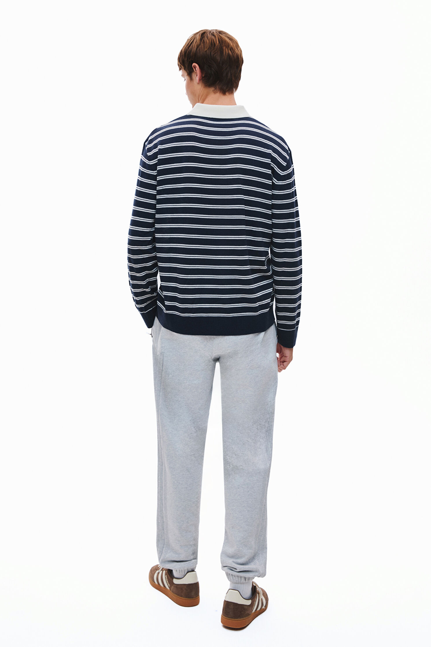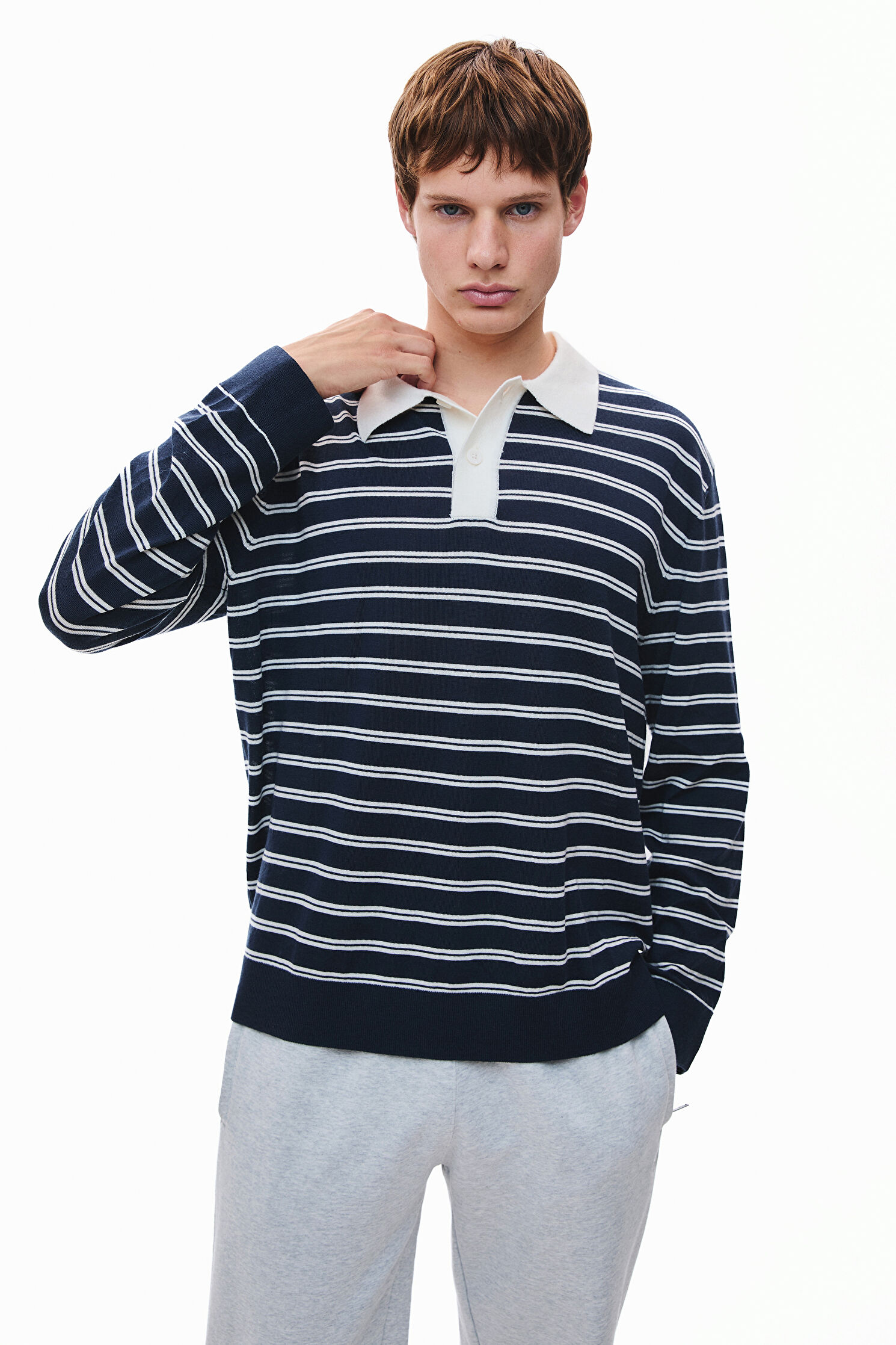 Polo yakalı Selected triko kazak, lacivert ve beyaz renk çizgili desenleri ile dikkat çekiyor. Bu tasarım, merinos yünü kumaştan üretilmiştir.